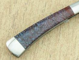 The blade is Damasteel with a CPM154 back spring. The body with integral bolsters and end caps is hardened 416.