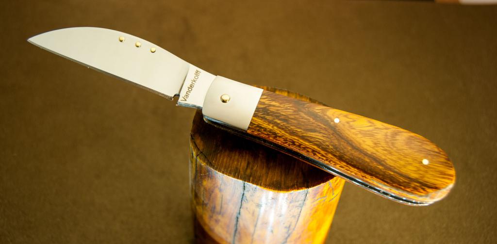 The Sparrow Slip Joint 3 1/4" closed, 6" open Blade and back spring CPM154 Body with integral bolsters is 416 stainless steel Covers are Ironwood Dellana Dots, cover pins and pivot pin are brass Available for Order