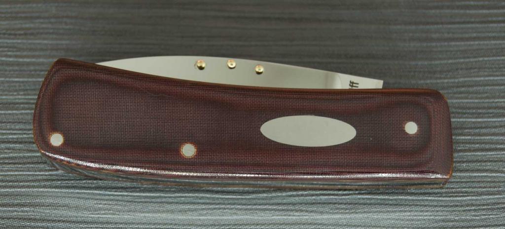 It is 3 1/4" closed and 5 3/4" open. The blade and back spine are 154CPM and the body is Maroon Canvas Micarta. It has a full half stop and is flush in all three positions.