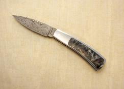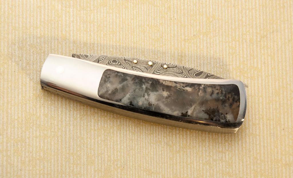6 1/2" open, 3 3/4" closed Blade is Boomerang Stainless Damascus from Chad Nichols Back Spring is CPM154 Body is 416 Inlays are Dendretic Sage Agate Dellana Dot Grip System $500USD delivered