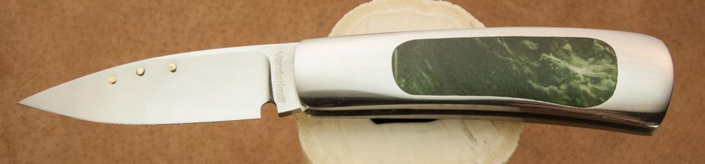 Slip Joint with Jade inlay. Just a simply elegant rendition of the venerable slip joint pocket knife. With an inlay of precious variegated jade. Nice and snappy. $450 USD