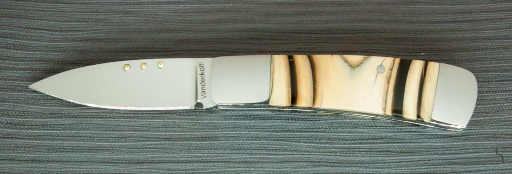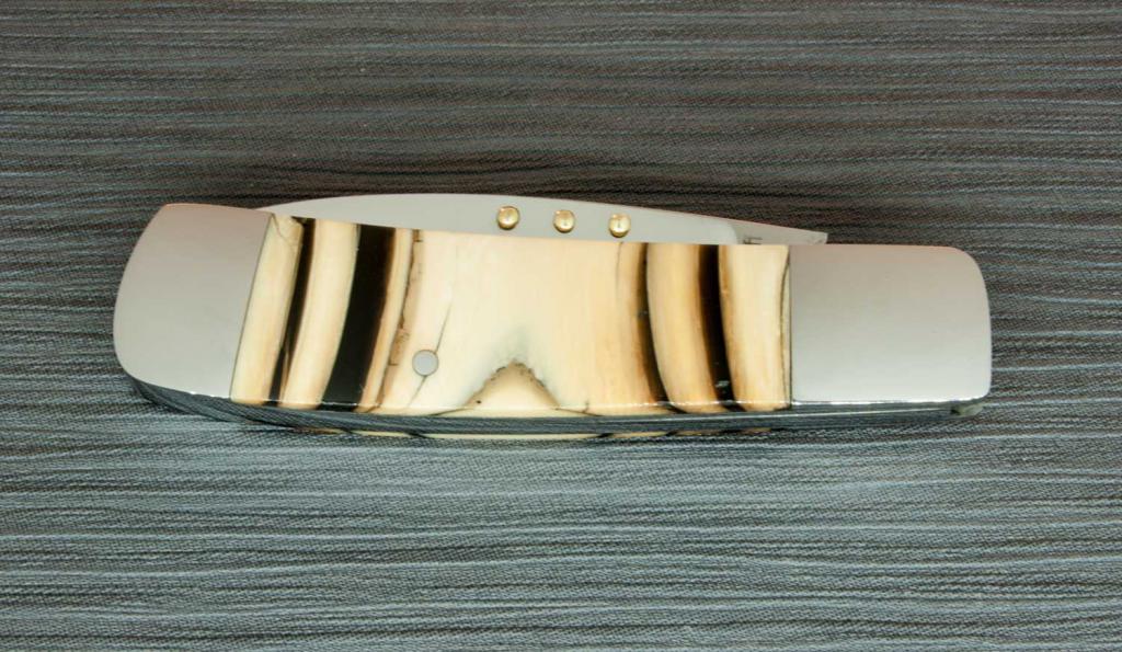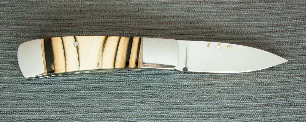 3 3/8" closed, 5 3/4" open CPM154 blade and back spring 416 body with integral bolsters Dellana Dot Grip System Crosscut mammoth ivory covers